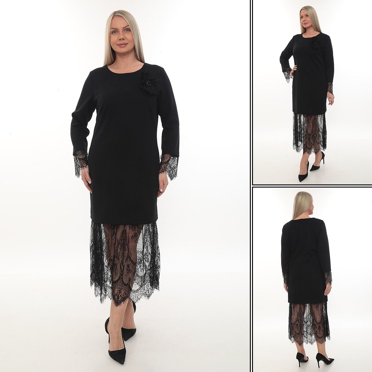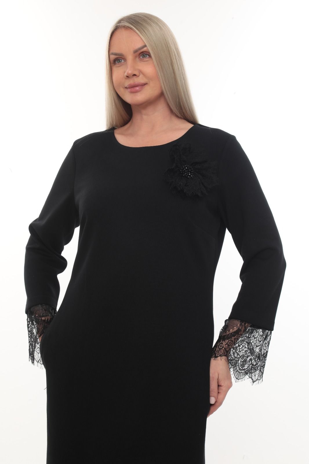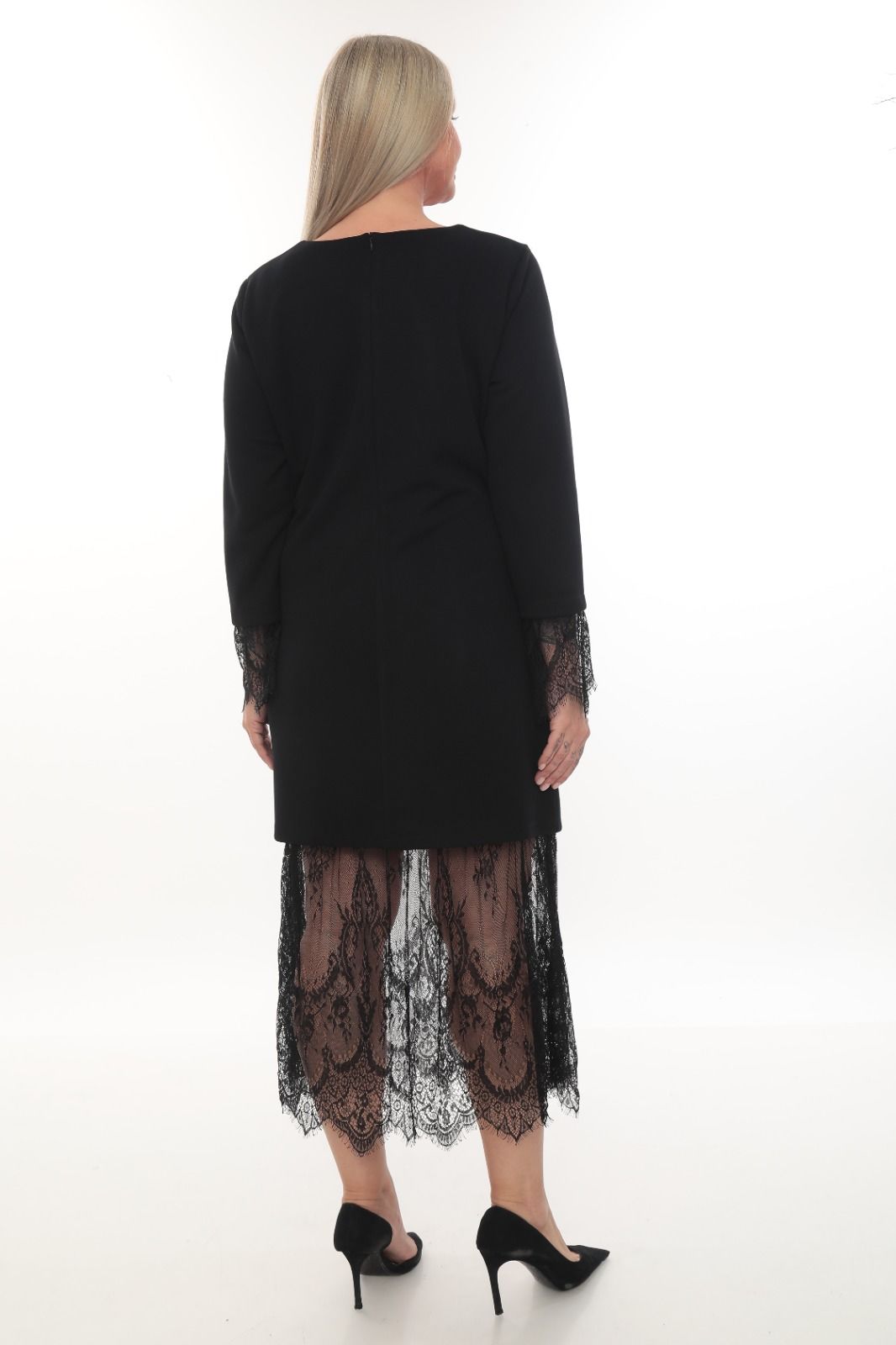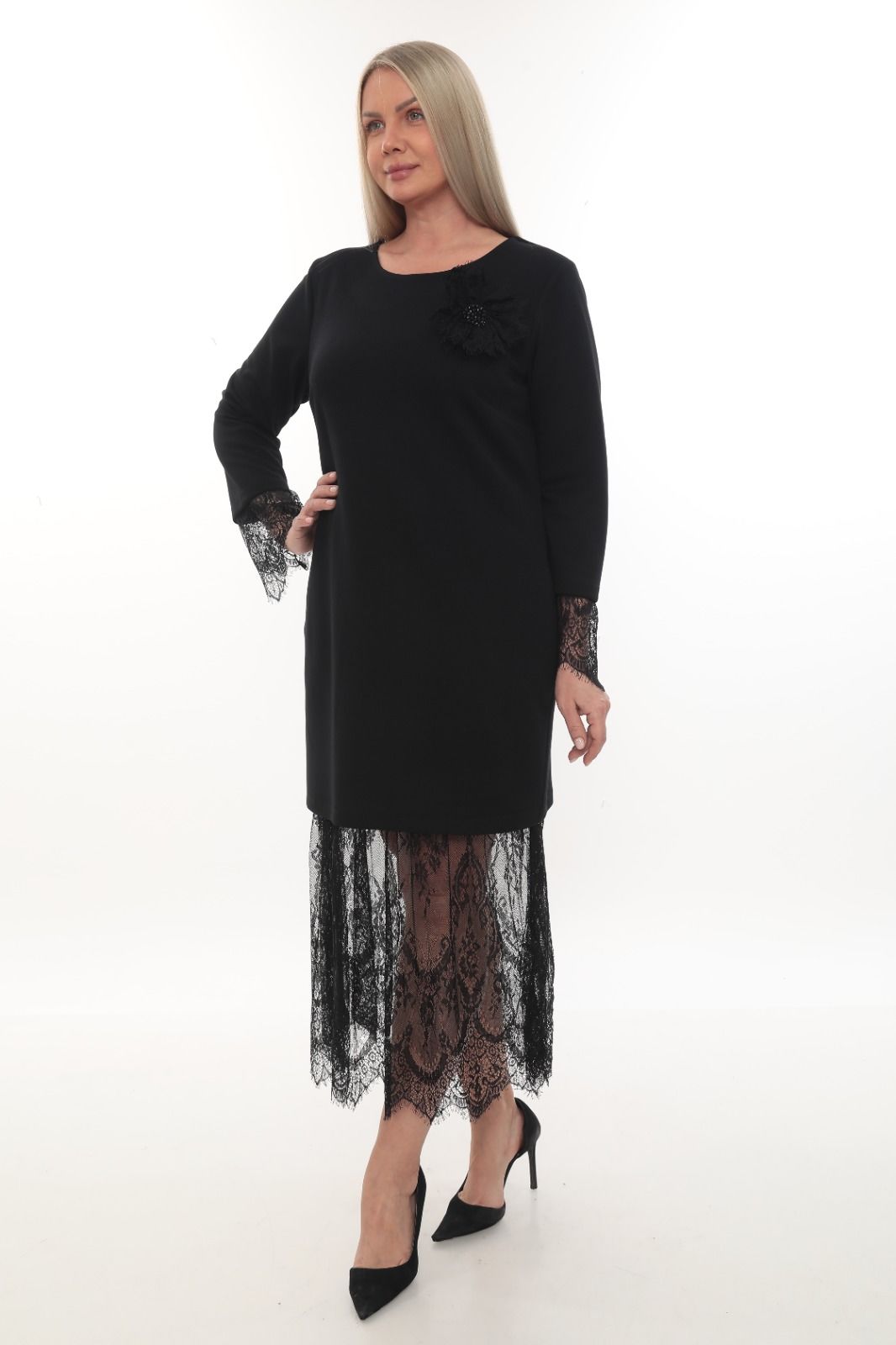 - Şık ve zarif bir görünüm için dantel detaylarıyla süslenmiş uzun siyah abiye elbise.