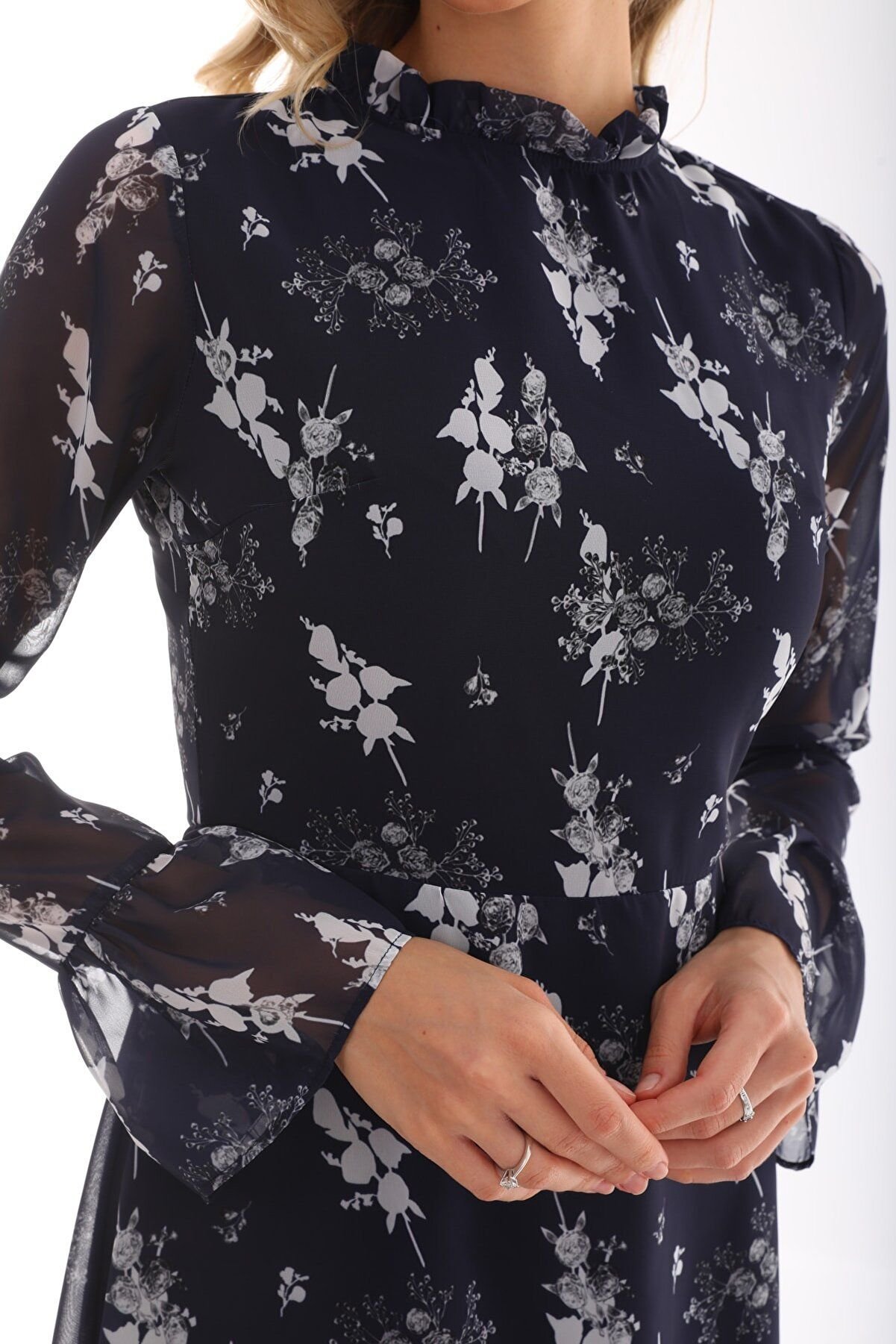 Dik Yaka Uzun Kollu Etek Ucu Fırfırlı Desenli Elbise ETS4311 38 - Lacivert