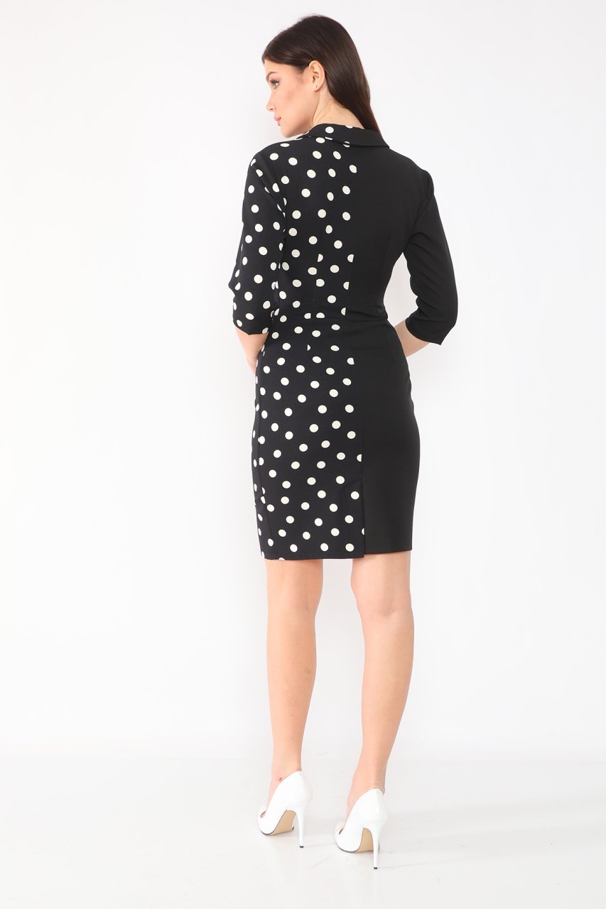 Yaka:Kruvaze YakaBoy / Ölçü:MidiKapama:FermuarlıDesen:PuantiyeliKol Tipi:Truvakar KolKumaş Tipi:DokumaStil:CasualModel:KruvazeKalıp:Bele OturanMateryal:PoliviskonRenk:SiyahKumaş / İplik:Pamuk PolyesterKol Boyu:Truvakar KolÜrün Detayı:DüğmeÜrün Tipi:Düz