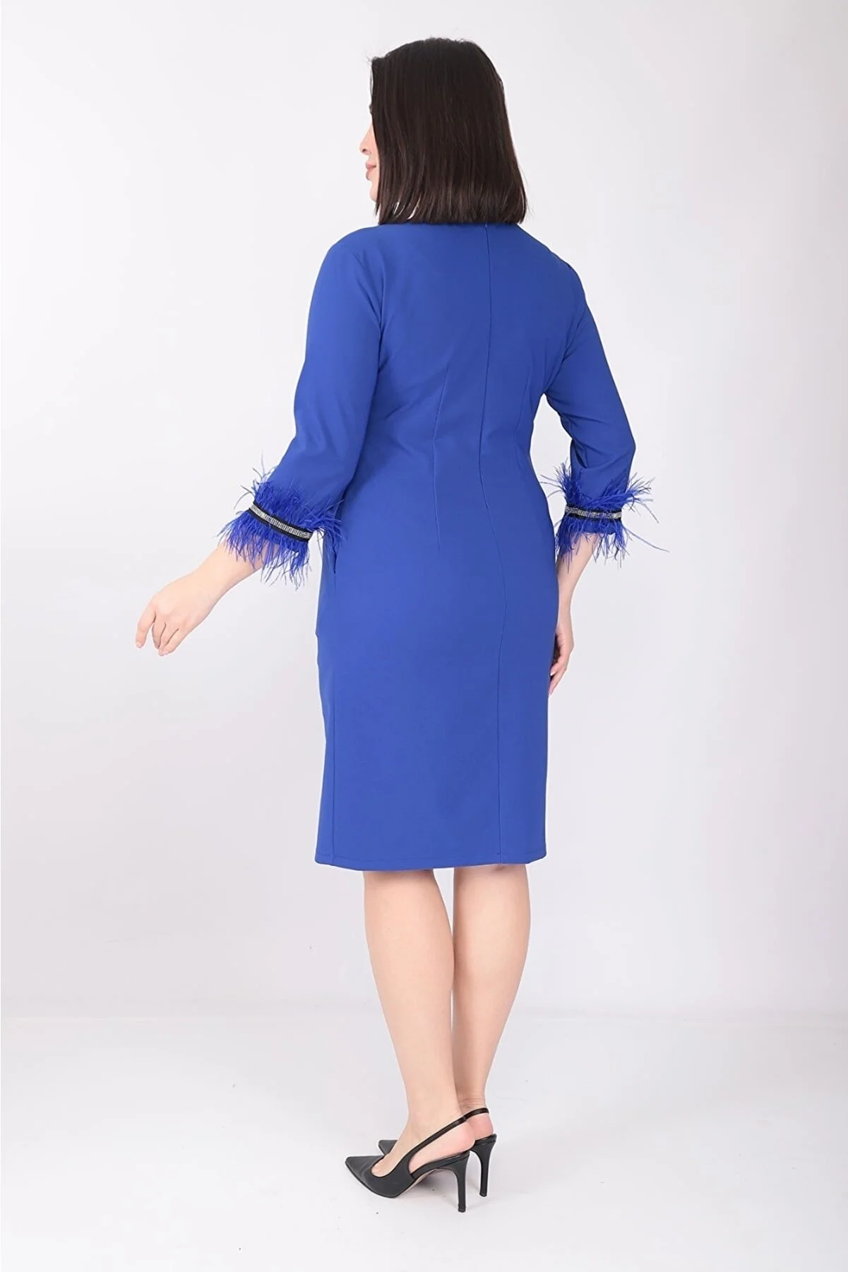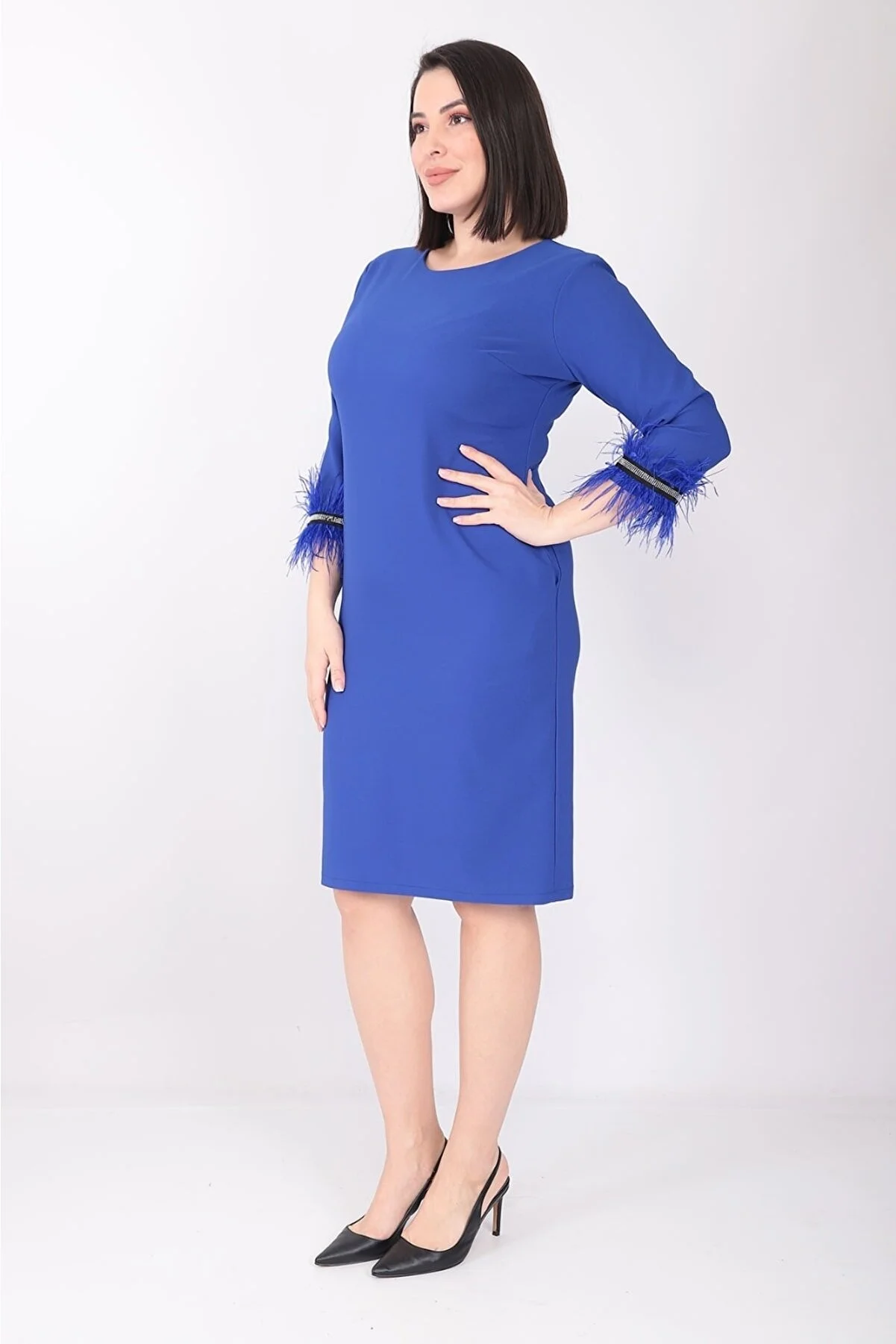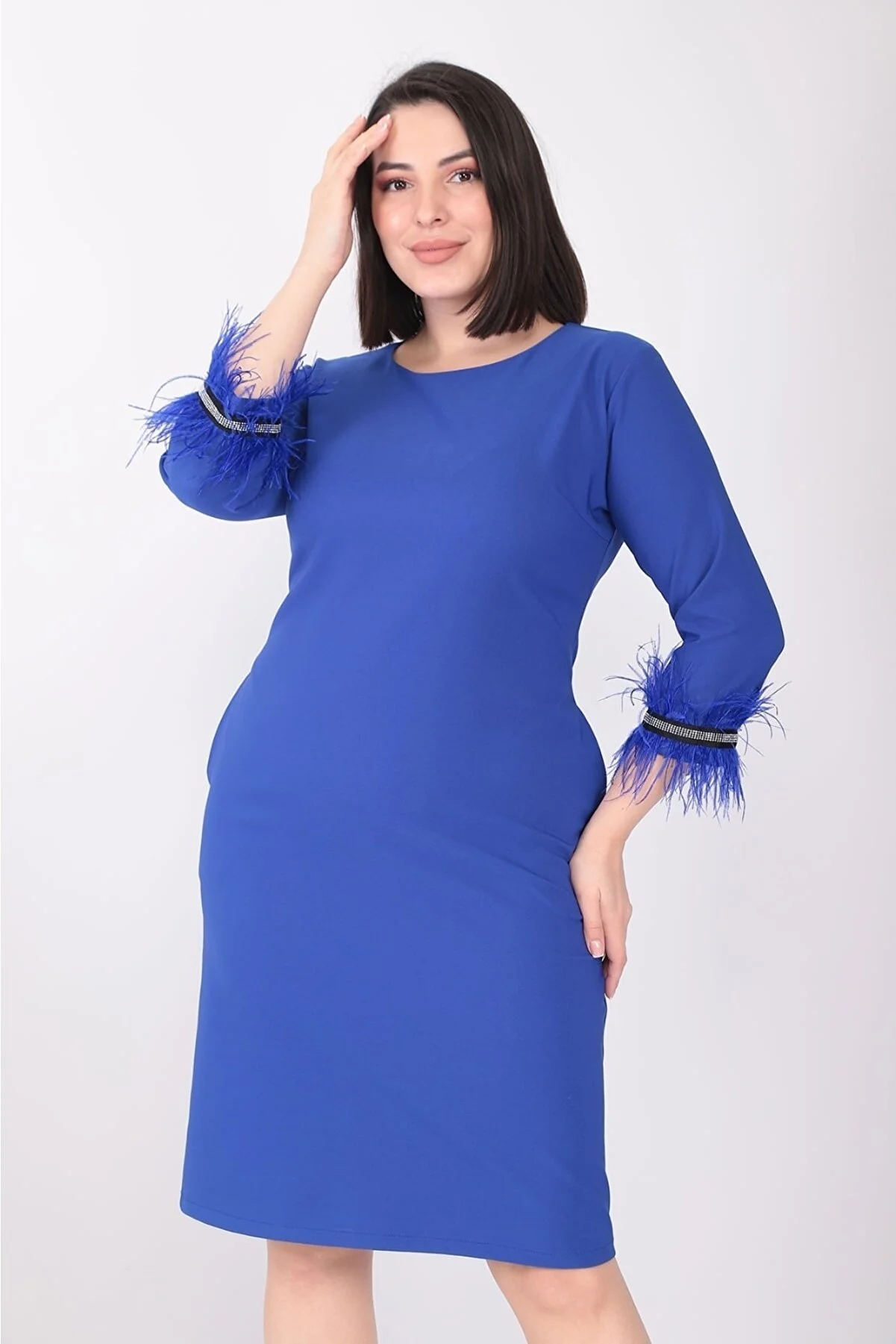 etselements X Modapo Kadın Düz Renk Bisiklet Yaka Kolu Tüylü Midi Büyük Beden Elbise MDP3113 Mavi - 48