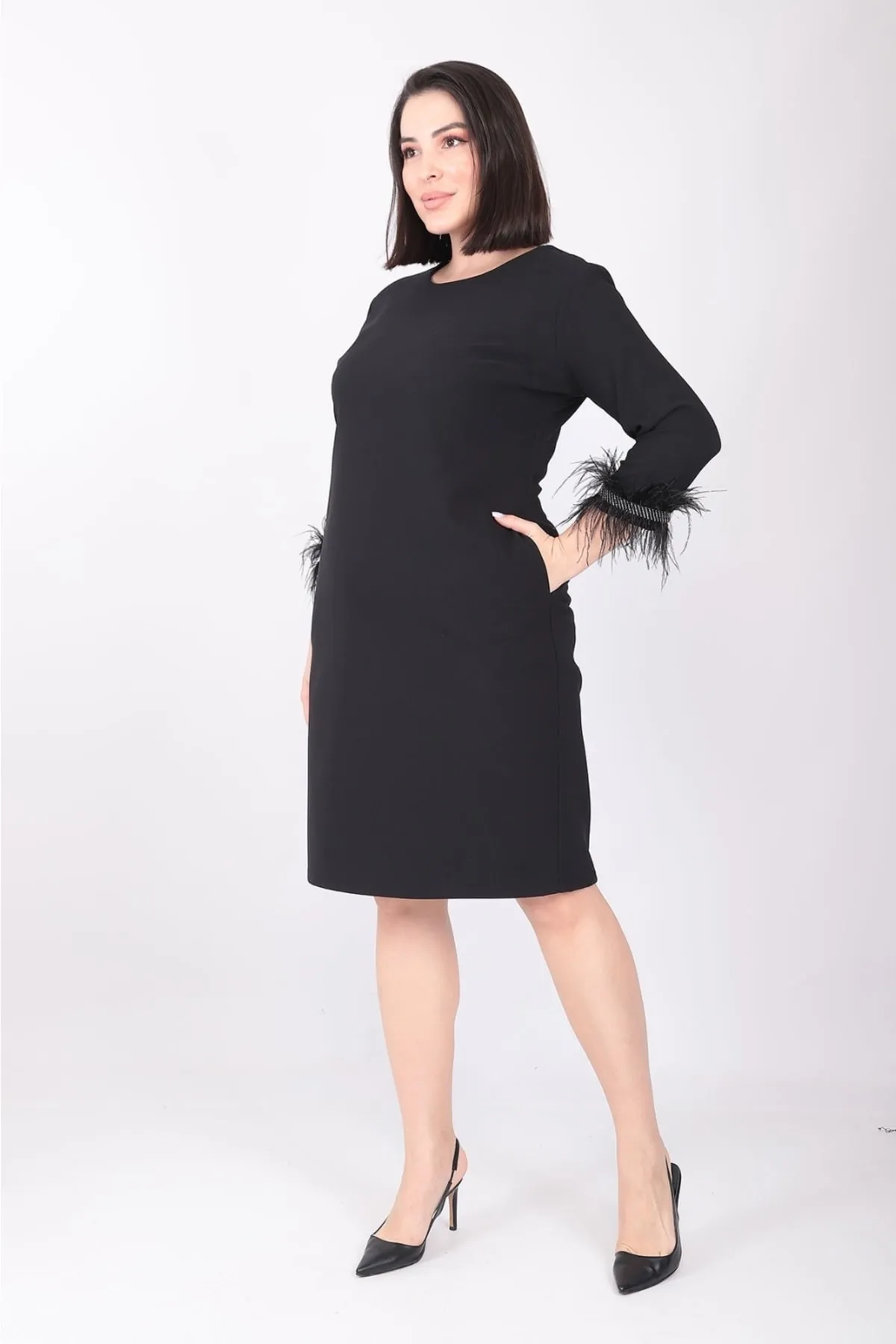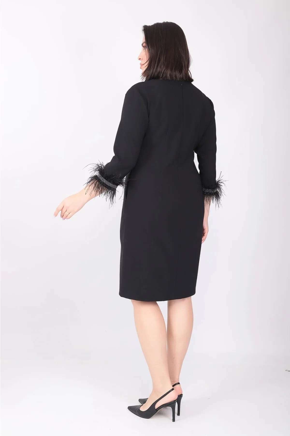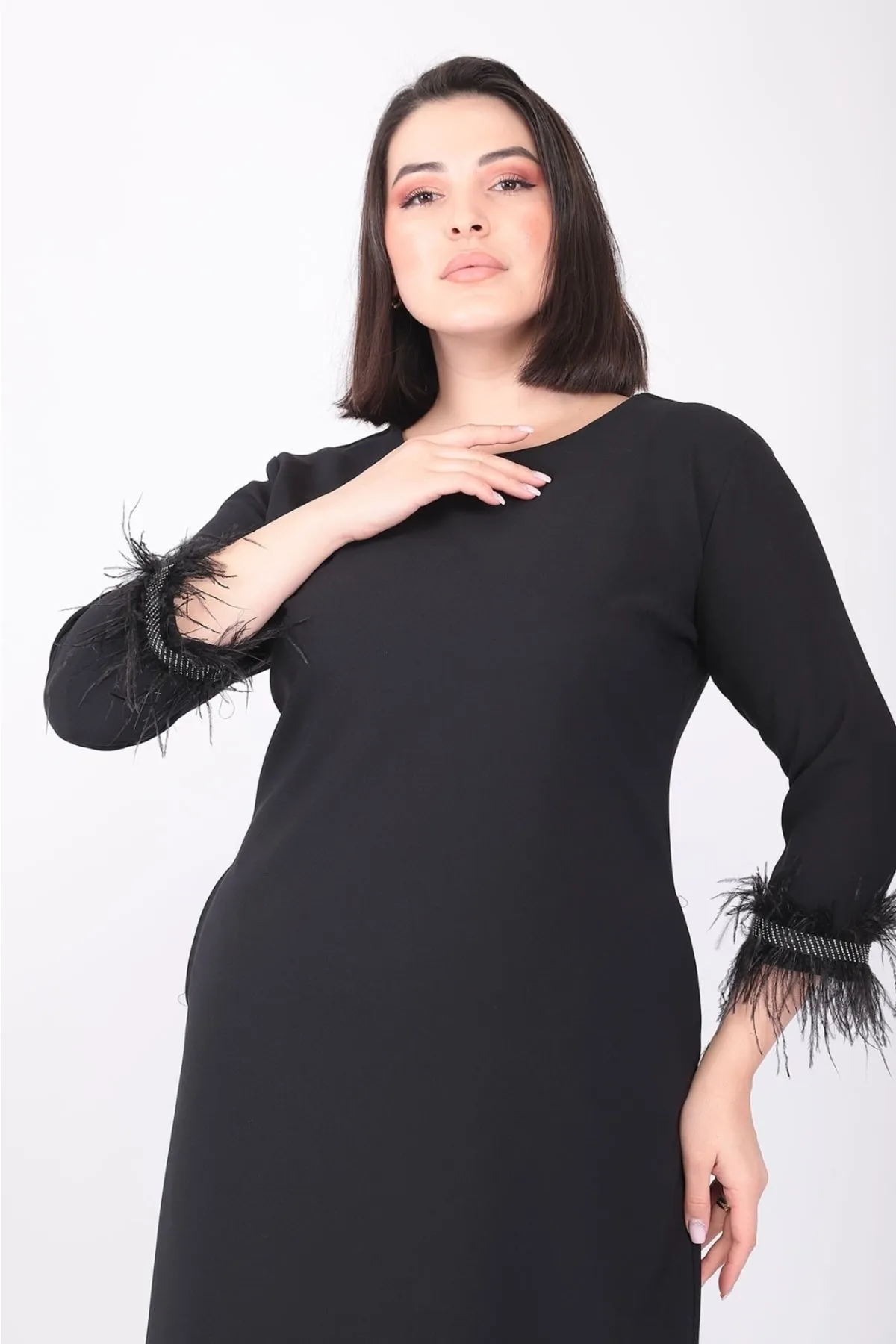 etselements X Modapo Kadın Düz Renk Bisiklet Yaka Kolu Tüylü Midi Büyük Beden Elbise MDP3113 Siyah - 48