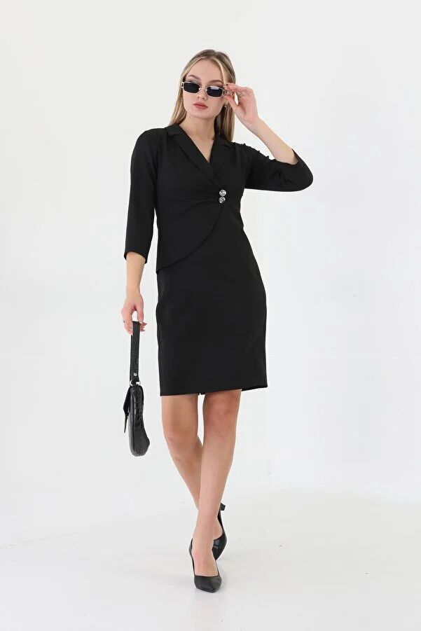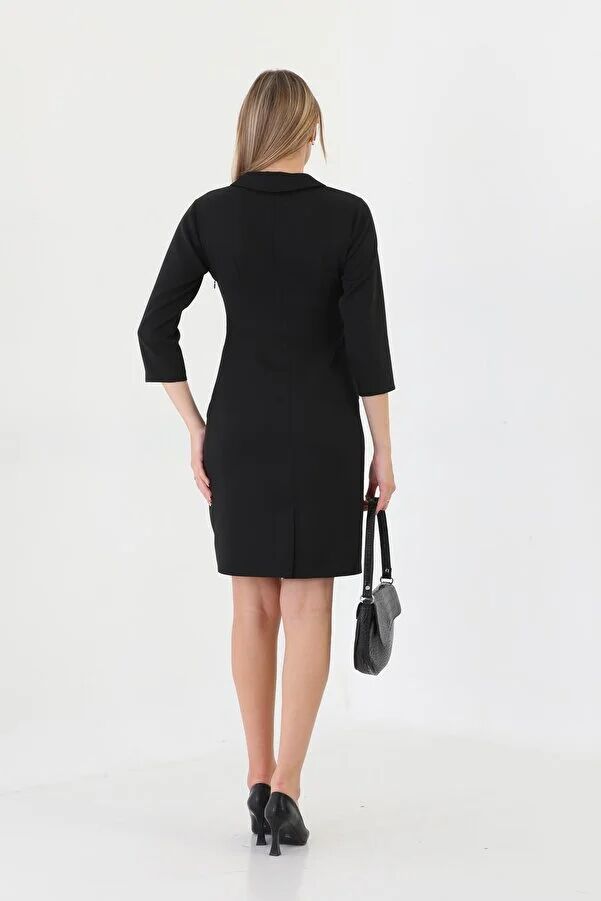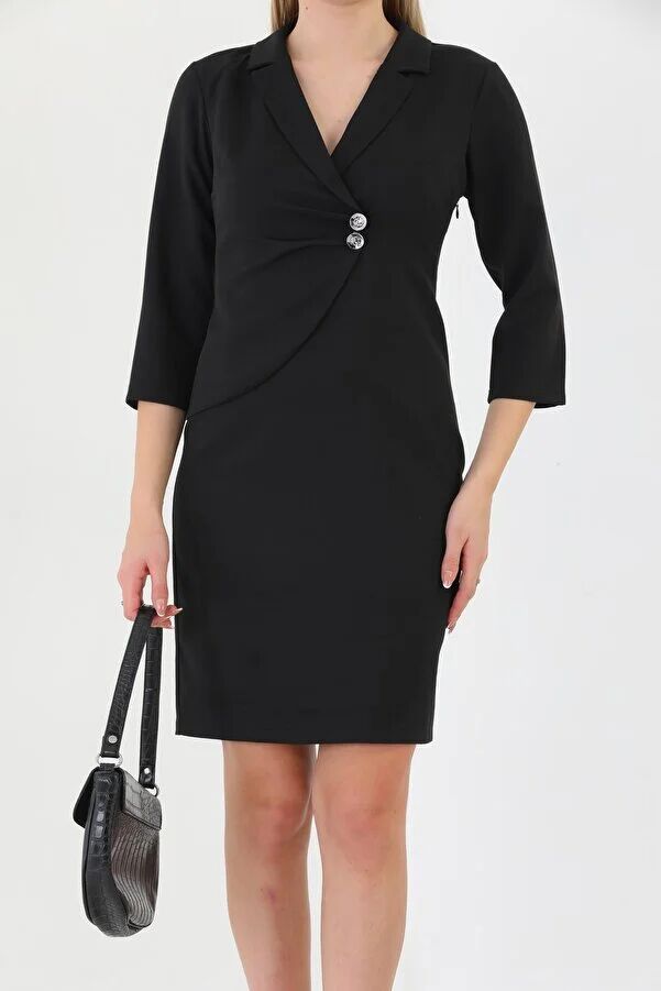 Kruvaze Yaka Ve Ön Kısmı Düğme Detaylı Ofis Elbise ETS5221LACI 42 - Siyah