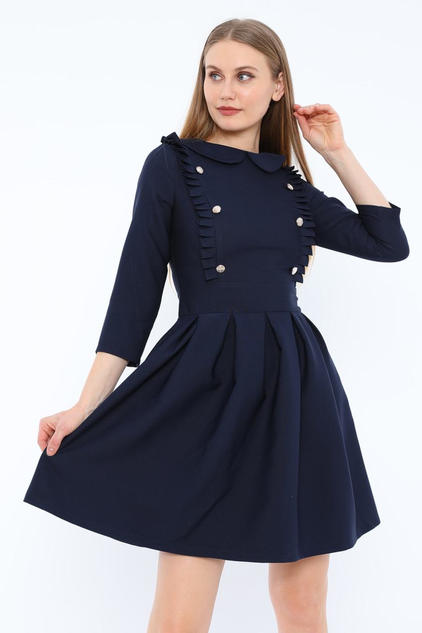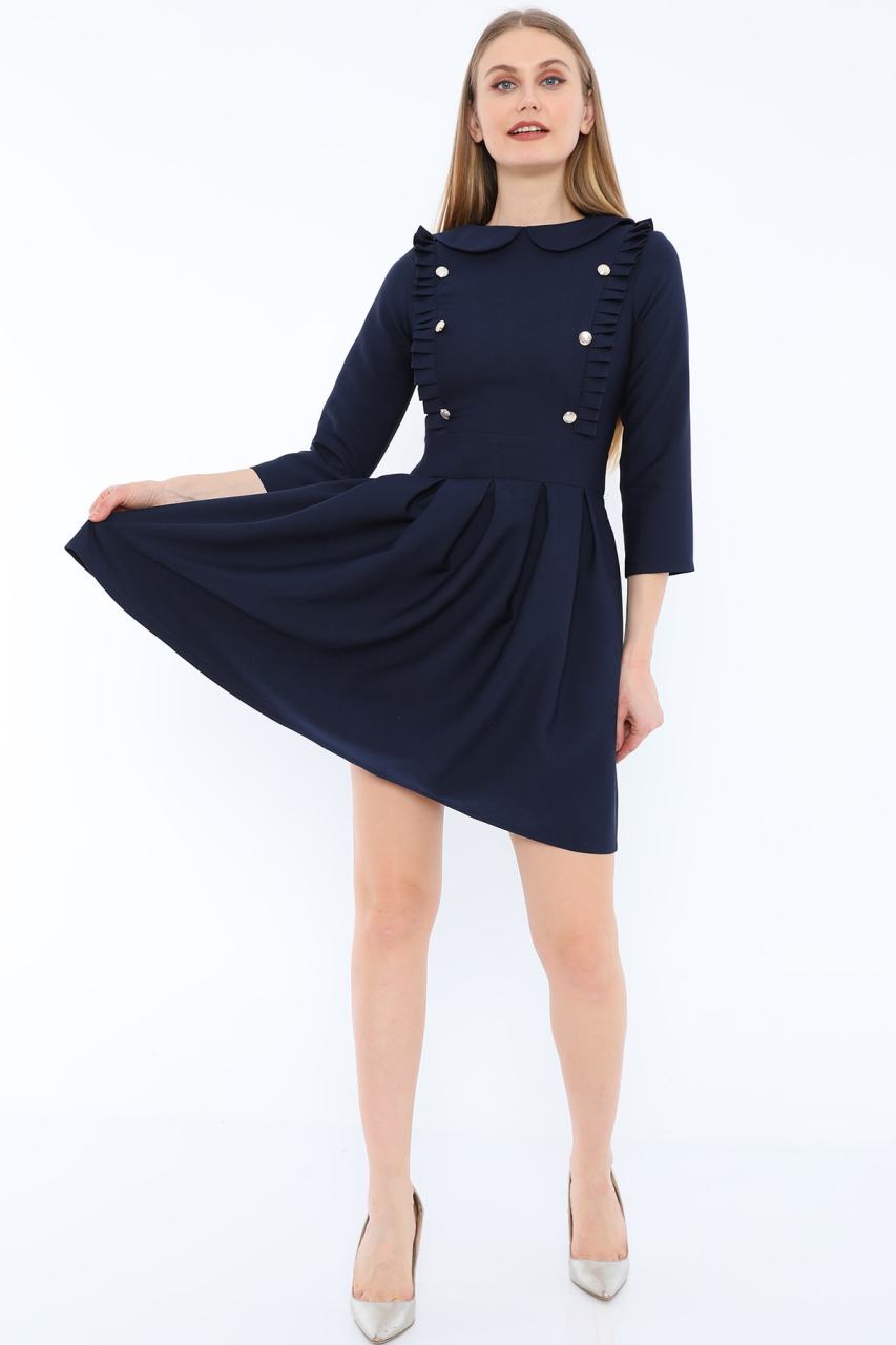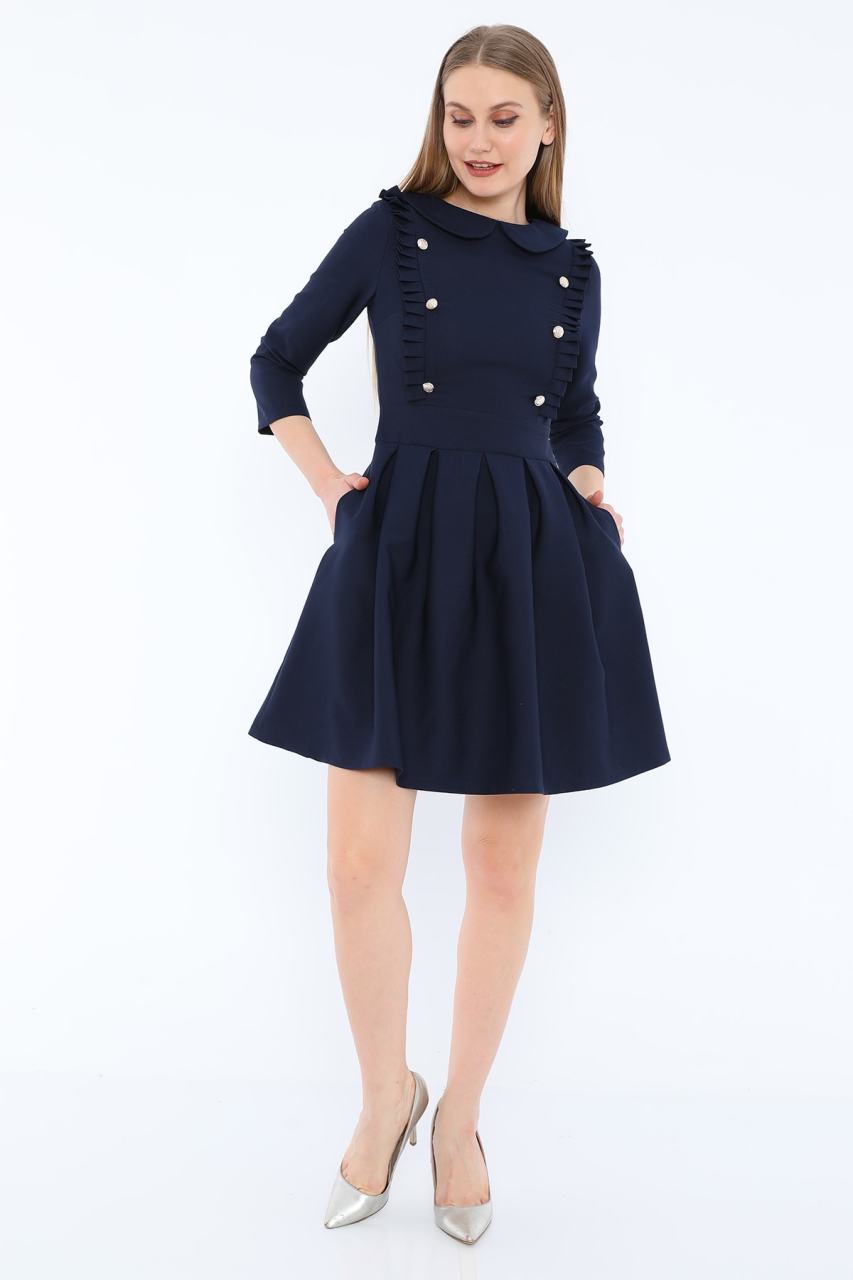 Kumaş Tipi:DokumaMateryal:LikraBoy / Ölçü:MiniDesen:Düz RenkKol Tipi:Truvakar KolKapama:FermuarlıKalıp:StandartStil:TrendYaka:bebe yakaRenk:LacivertÜrün Detayı:Düğme
