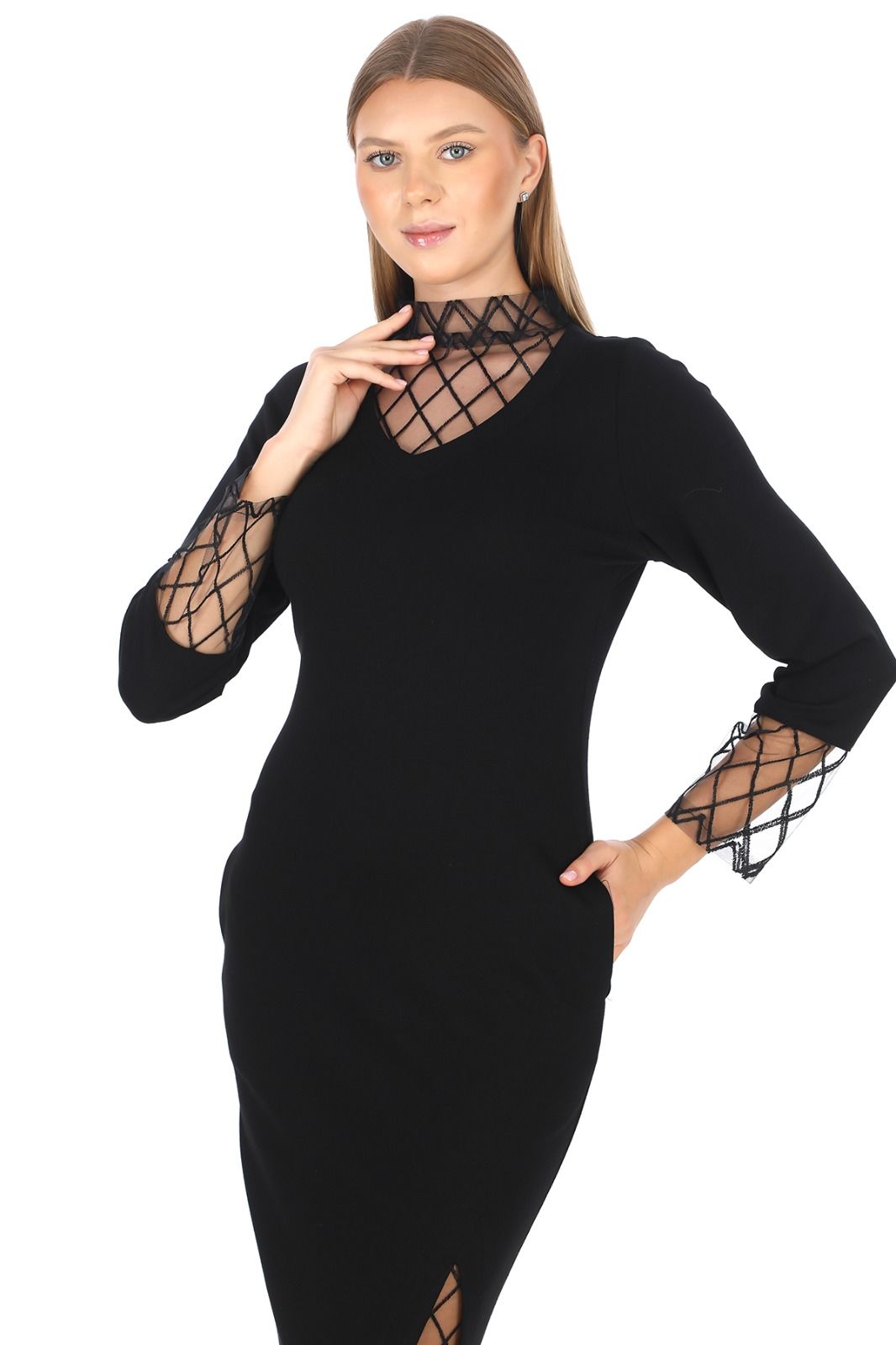 Roba Balıkçı Yaka Tül File Detaylı Yırtmaçlı Elbise, esnek bir kumaş olmasıyla rahat bir kullanım sağlar