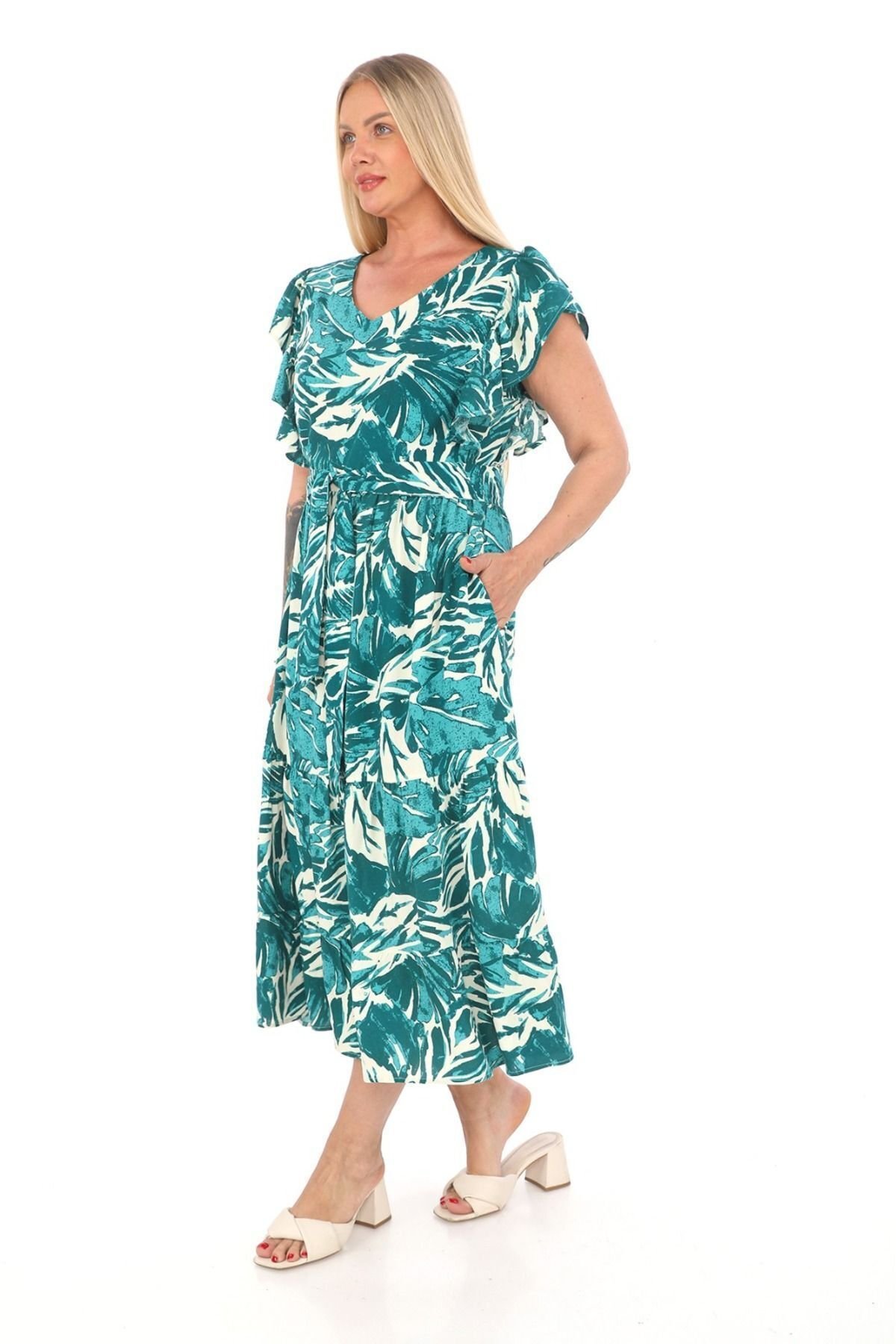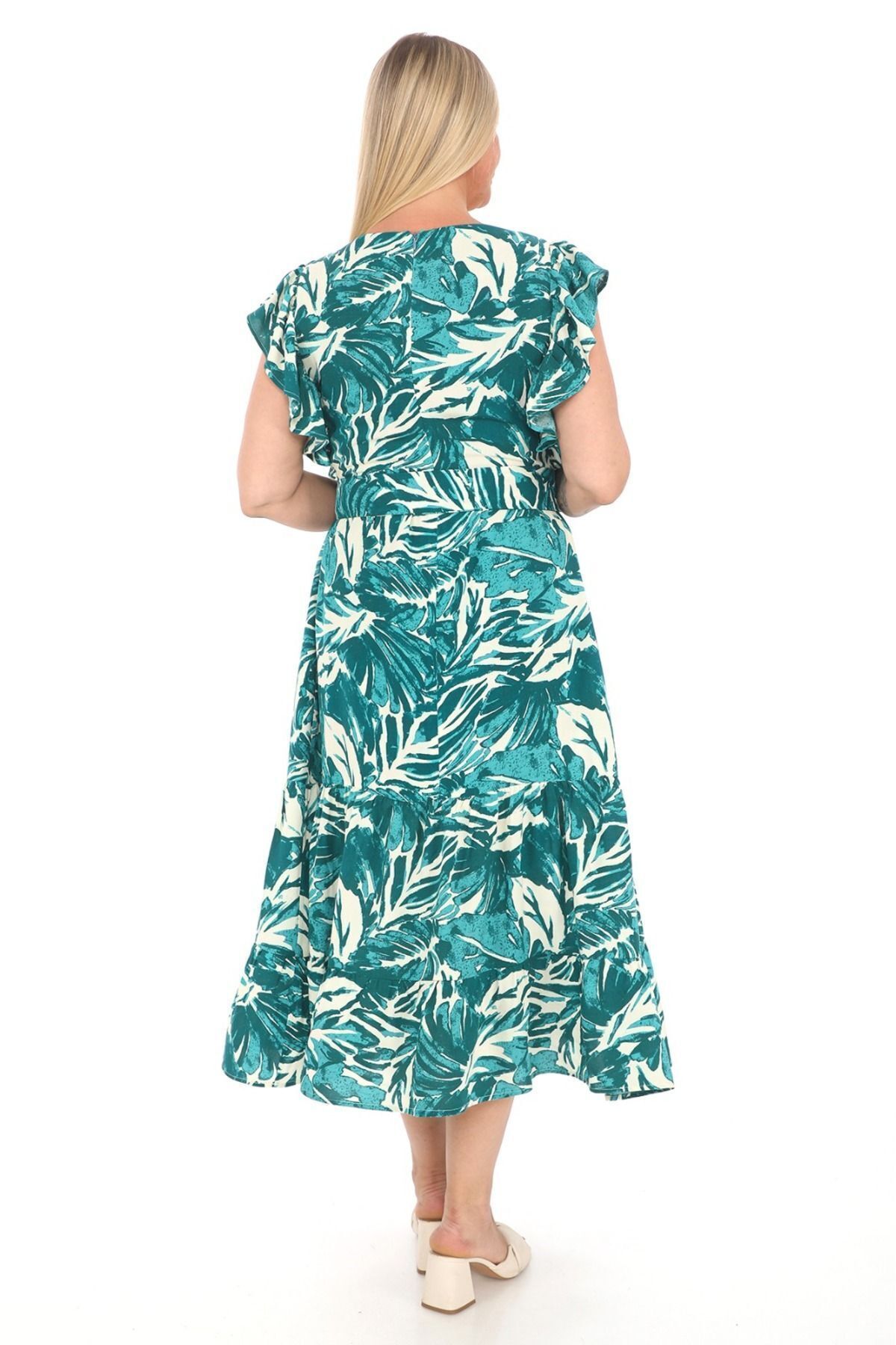 Volan Kollu V Yaka Kuşaklı Desenli Uzun Viskon Elbise Ets5284 Yeşil-Beyaz - 44